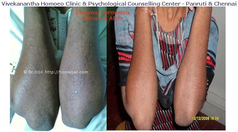 घावों की उपस्थिति के आधार पर उपचार भिन्न हो सकता है। “वीपिंग” घाव, शुष्क स्केली घाव, या पुरानी सूखी, मोटा घाव प्रत्येक अलग से इलाज किया जाता है। लक्षण होम्योपैथिक दवाएं बिना किसी दुष्प्रभाव के सभी प्रकार के एक्जिमा में अच्छी तरह से कार्य करती हैं।